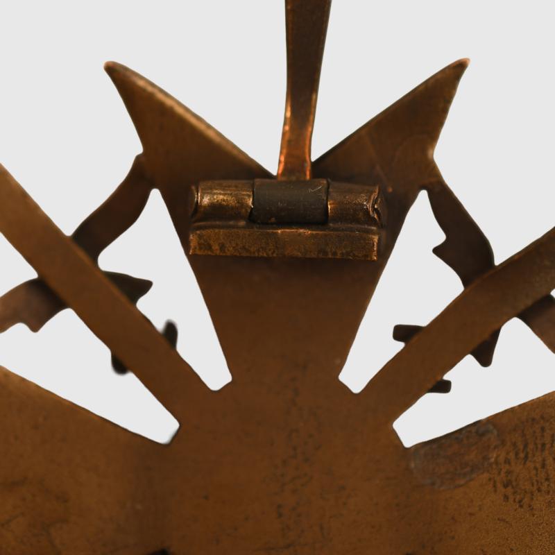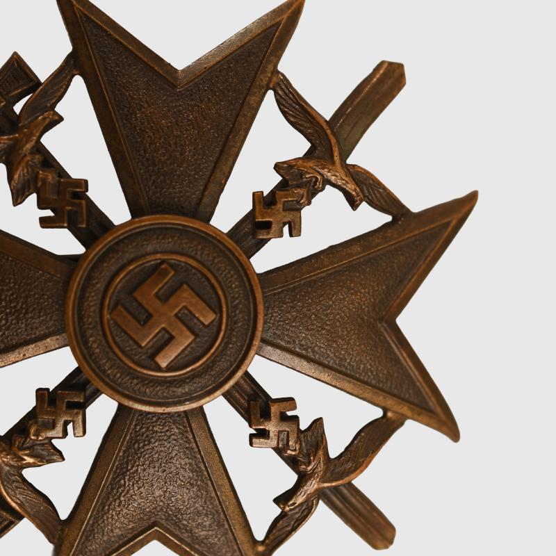 An extremely nice example of the Spanish cross in bronze with swords, the award retains 99% of its original bronze finish, cut out swastikas, very fine detail to the hilts of the swords, on the reverse side the original wide tapering pin, with its original hook and hinge, the pin itself has been slightly bent indicating to us that this is a service used piece, we have noticed over many years of handling medals and badges that on the actual service used items the recipients bent the pins to help them secure them to the uniform tunic more securely.