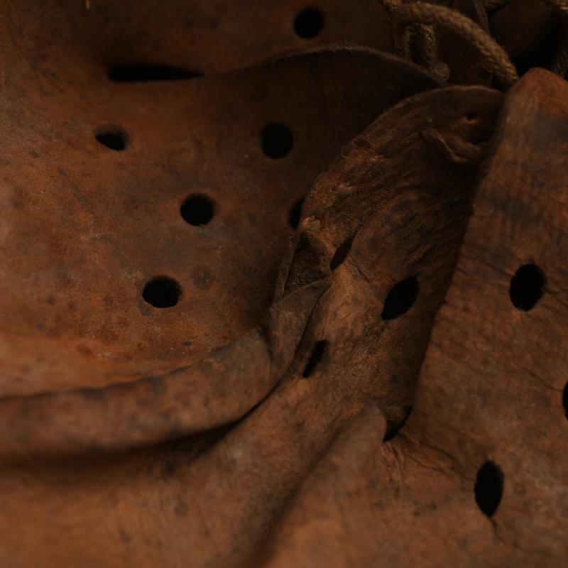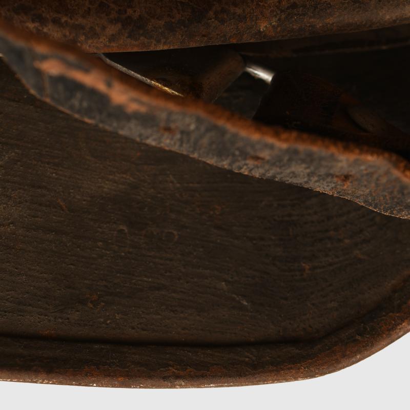 A good untouched size Q62 model 1935 double decal combat helmet that has been over painted in accordance with the 1940 regulations of eliminating the national tricolour. The army decal still good and clear, some minor loss of paint finish just above the right-hand side of the army eagle. The interior having a nice dry storage feel, the mid tan leather liner all complete, with its original drawstring, leather soft and supple. The chinstrap fitted to the square edged M 35 aluminium strap posts nicely marked E.A.S.40. Faint traces of the original wearer’s name painted into the rear skirt.