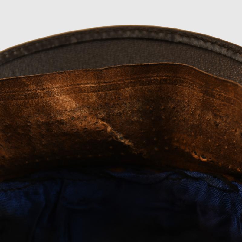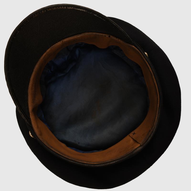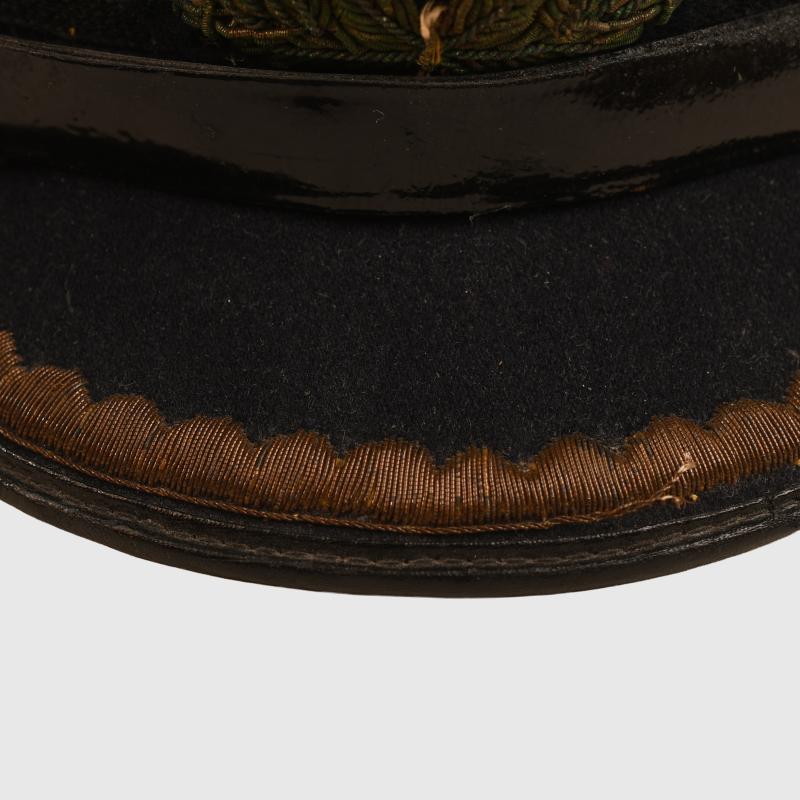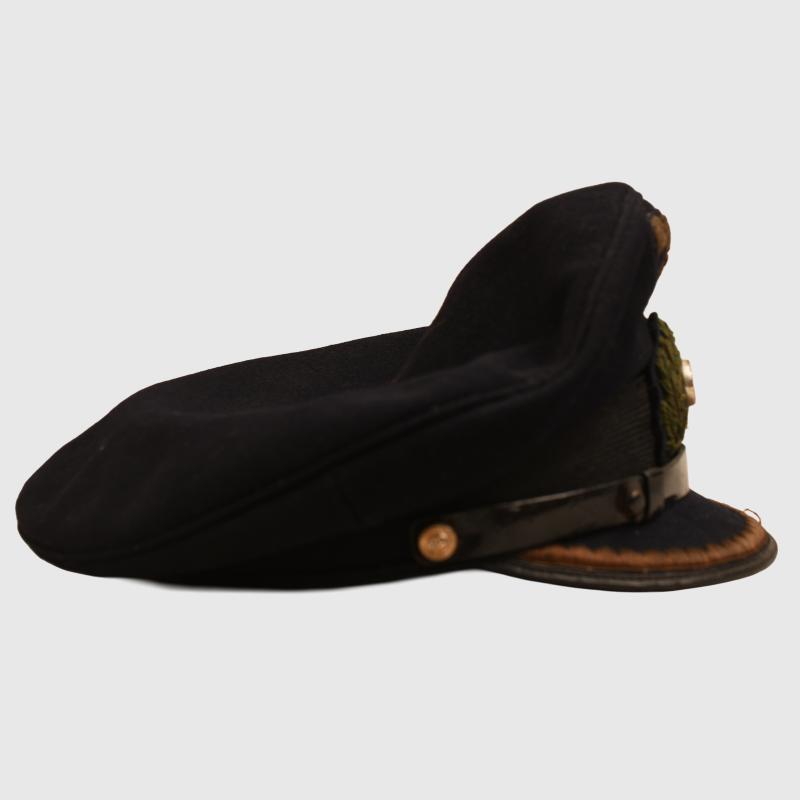A nice condition good size, possibly 57 although not size stamped, standard junior naval officers floppy dark blue visor cap. Classic shape for a navy officer. No moth to the upper body of the cap. Gold wire national eagle with gold wire rank braiding to the front of the cap and gold wire weave to the central cockade, the cockade has oxidised to a green colour. The cap is fitted with its correct naval officers strap with twin gilded side buttons. To the interior the leather sweatband in light tan has evidence of considerable wear use but all intact. The complete inner lining of the cap is mid blue rayon with evidence of hair grease to the upper inner crown, which was never fitted with a protective celluloid lozenge.