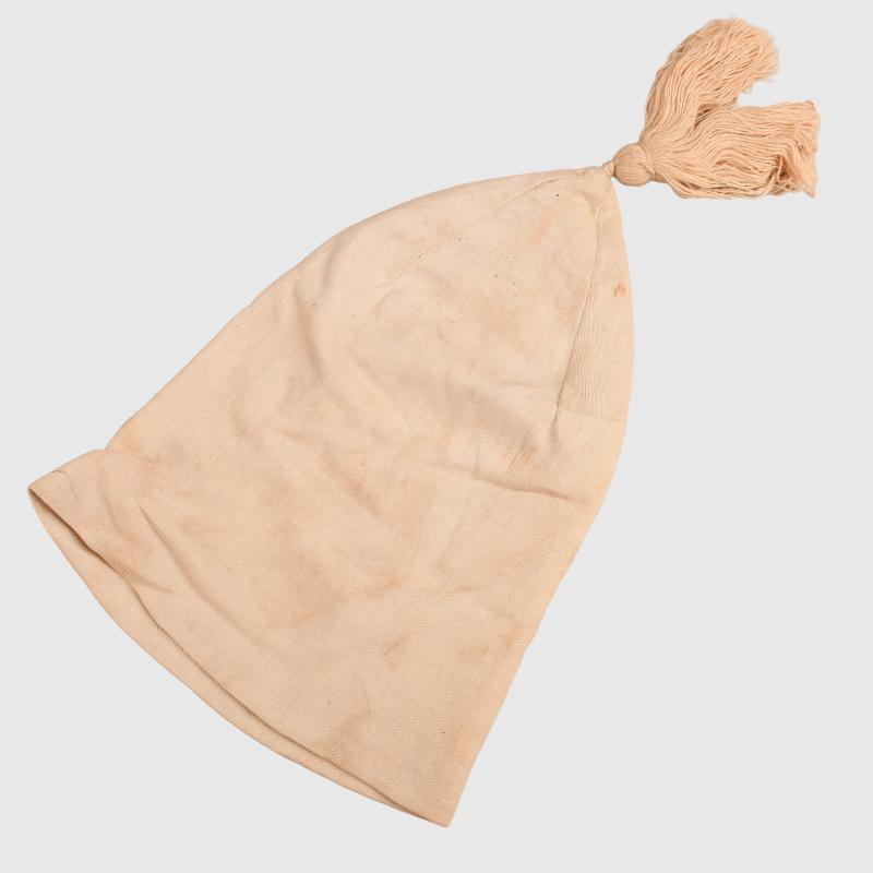 An unusual but extremely scarce all white cotton sleeping cap, An issued piece of clothing to the French soldier of World War I excellent condition with soldiers number to the interior.