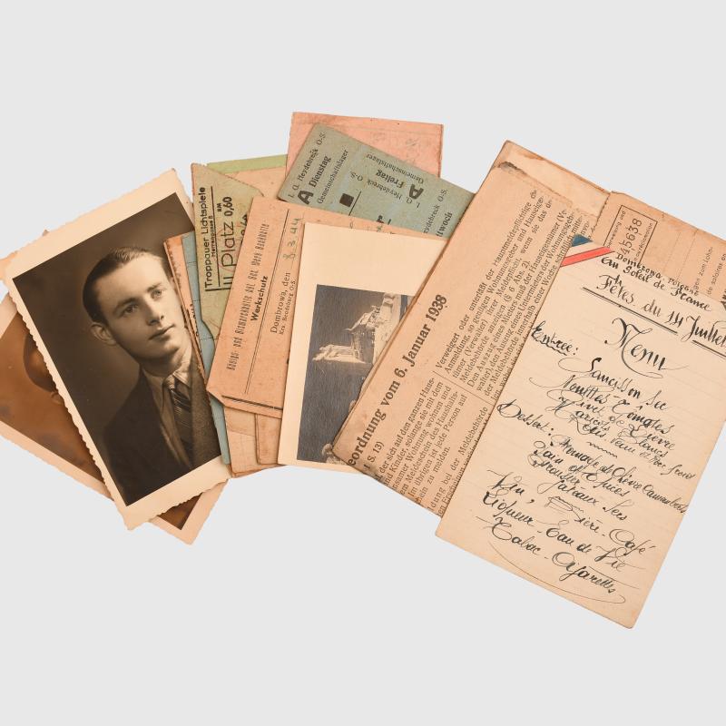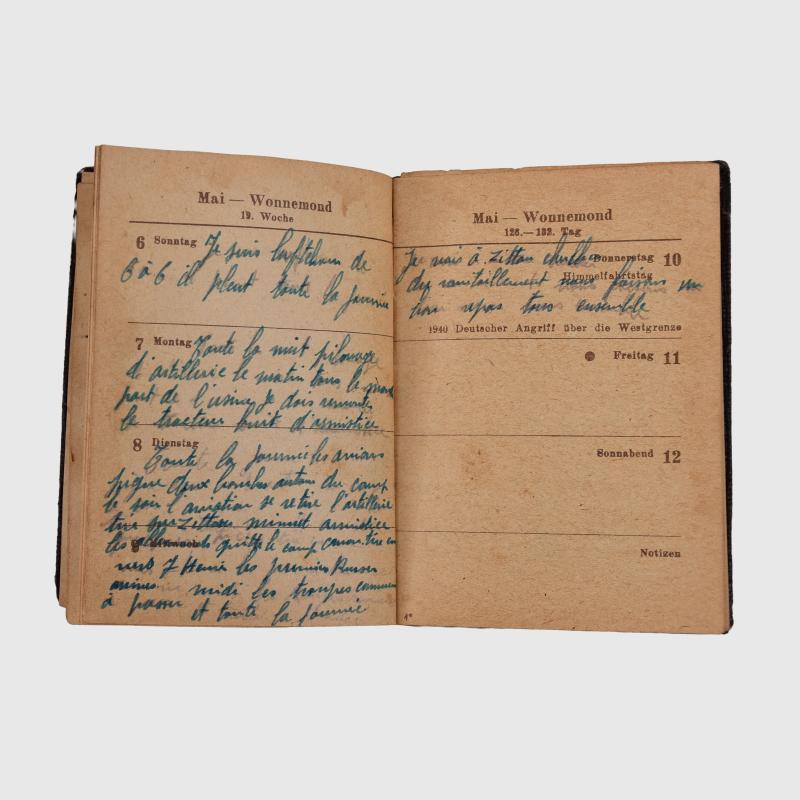 A very interesting grouping found in a French flea market recently, comprising the Vorlaufiger Fremdenpass, which is a temporary foreign workers passports. Al contained in a soldbuch pass holder with the silver embossed eagle and swastika to the face side with the word ‘Soldbuch’ below. The pass has been issued to a French citizen Henri Duranthon with a photograph of the recipient with the eagle and swastika over-stamps, the pass is dated ‘March 1944’. Within the pass there is a small quantity of loose paperwork, a restaurant menu, a German auslander pass, another pass Passierschein dated ‘1944’, a postcard from Perigueux in the Dordgogne in France to possibly his employers in Breslau in Germany, non posted, Perigueux is the area with the marketplace where this grouping was discovered recently. A further mixture of French and German documents and handwritten annotations. A further multi folded document very delicate in a mixture of Czech and German indicating he may have been working in one of the occupied lands. Further to the pass and its contents there is a separate ‘1945’ dated diary with many handwritten annotations, including many annotations around the date of the 6th/7th/8th, 9th May 1945. Lastly and possibly the most important items in the grouping his original plastic protected ausweis for him to enter the works on the I.G.Farben industries and the extremely rare identity disc to enter the I.G.Farben plant at Heydebreck. The I.G.Farben plant in Heydebreck in Pomerania, now in Poland was to create chemical plants capable of producing a new type of synthetic fuel. There were various camps for political and work prisoners in the area. The whole grouping is worthy of further research.