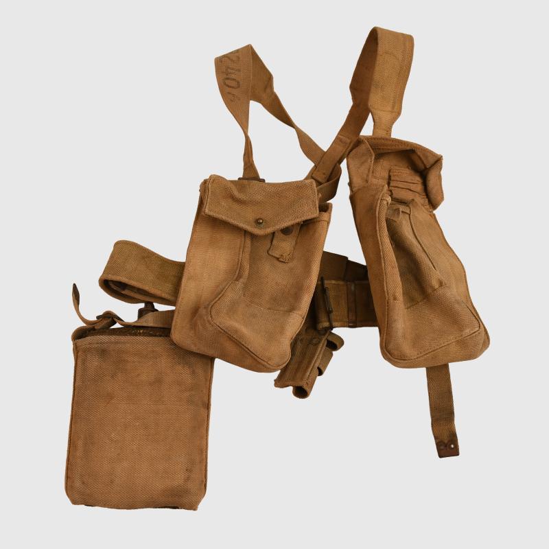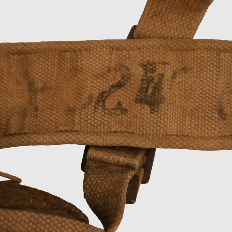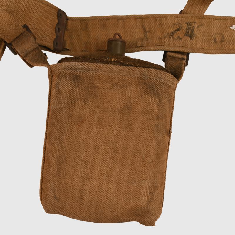A blancoed set comprising the waist belt, two ammunition pouches, cross straps, water bottle and bayonet frog. Some visible markings, which appears to be a soldier’s number. No dates or other issue markings.