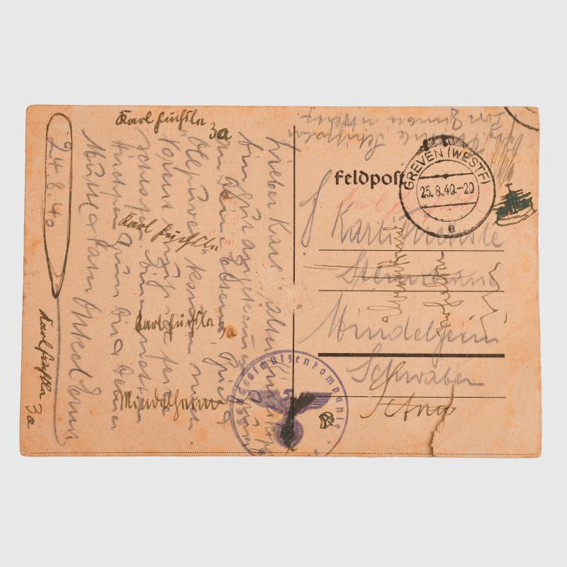 A print of an original painting of a three man motorcycle crew. One small tear 2cm long to the left hand side of the card. Dated ‘25th August 1940’ to an address in Germany. Fully written out with news by now of occupied France.
