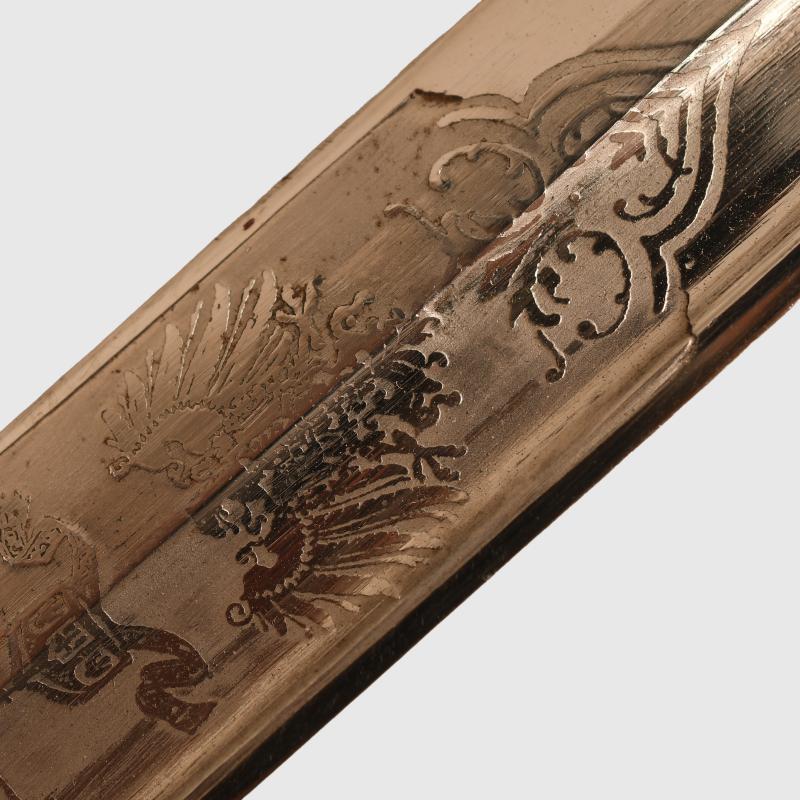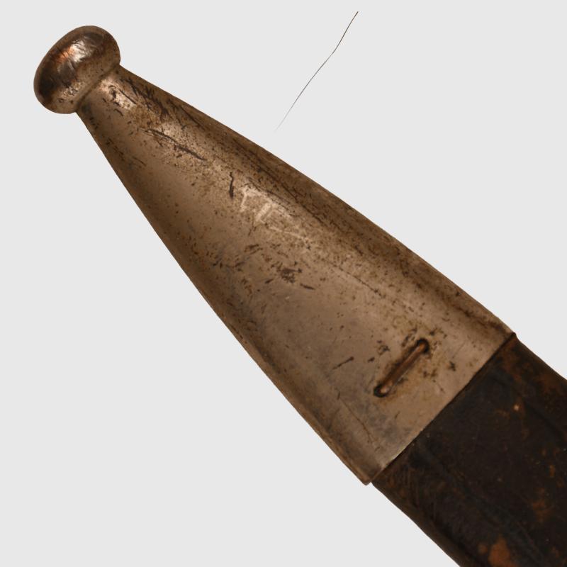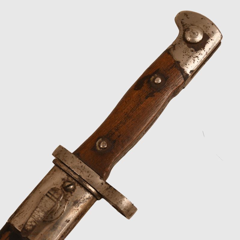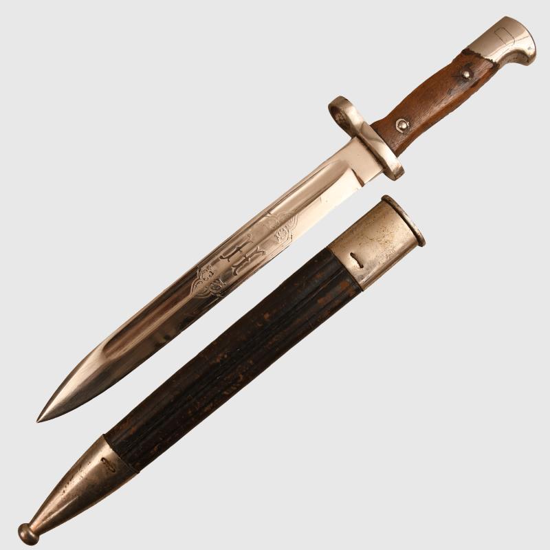 A very fine example of the Mauser 71/84 bayonet with excellent bright blade. To one side it has a panel with the Colonial style crown and ribbon with the Imperial style eagle below. On the reverse side a similar size panel with what appears to be two gothic letters F or K to the centre, this may represent the initials of the owner. The plating to the pommel, back strap and muzzle ring is thin in place. The wood grips are good, slightly discoloured, in its original leather scabbard, with its correct scabbard mounts all in nickel match to the bayonet. The sale of Knives, other Edged Weapons and Firearms are restricted to those aged over 18. Verification of age is required before purchase is concluded, this will include providing a scan of photo ID including your address and in some cases may require video verification by FaceTime or WhatsApp video, at Regimentals discretion, until formal laws on this requirement are enforced in the UK.
