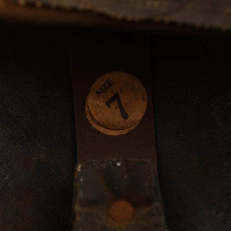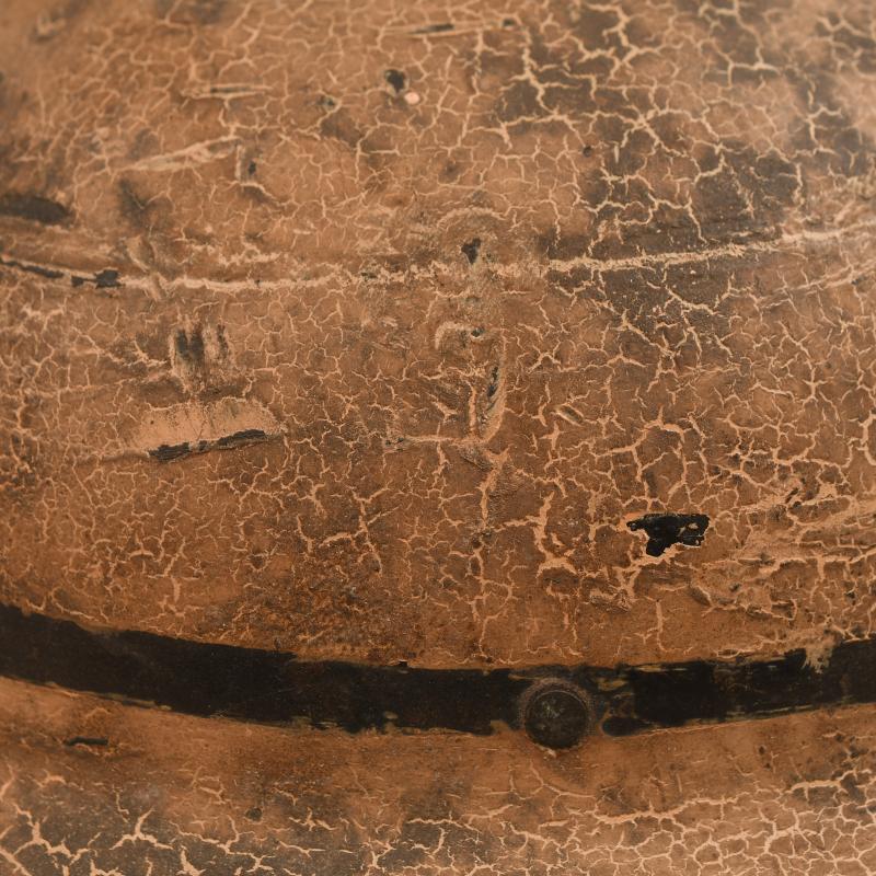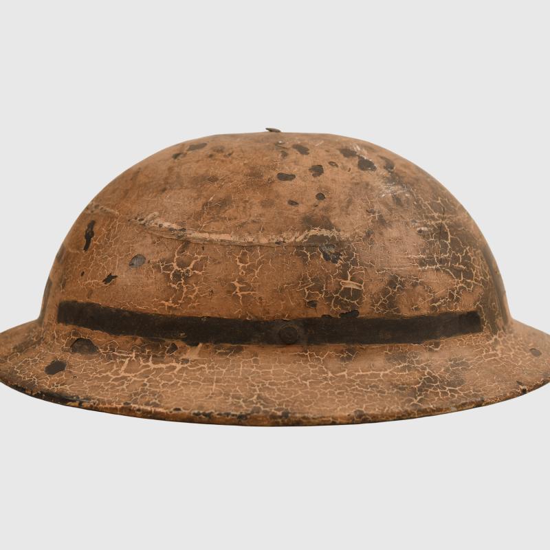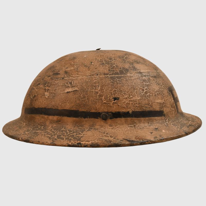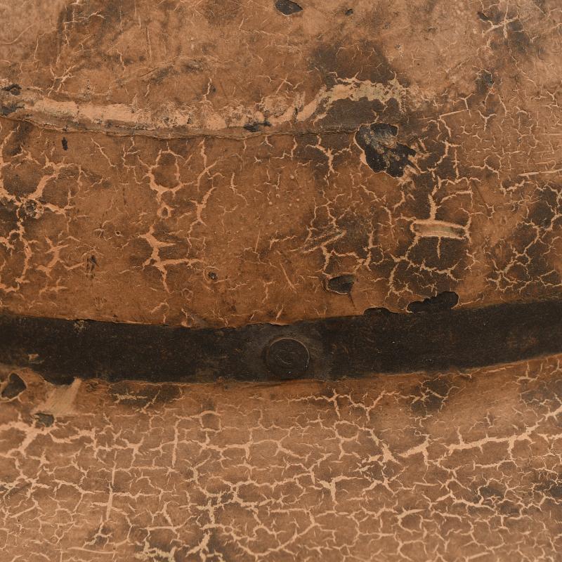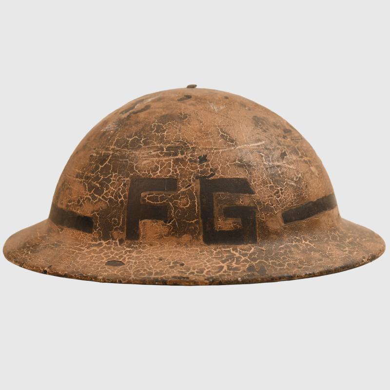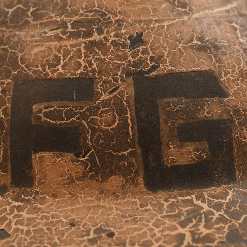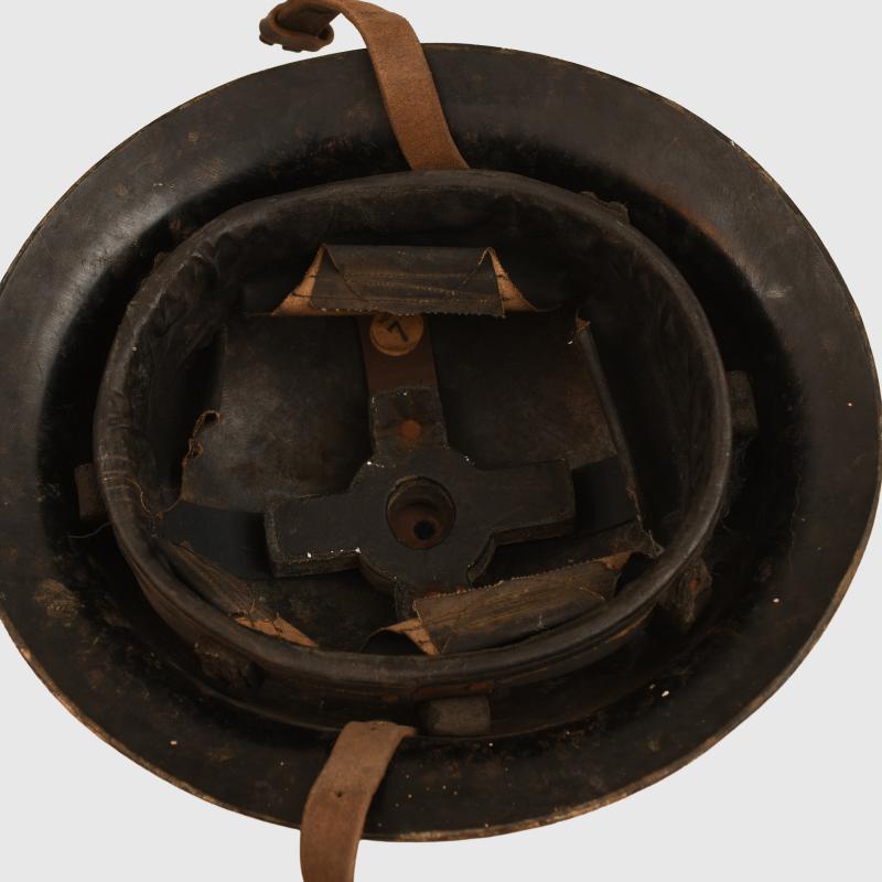 A most intriguing helmet being the commercially available item manufactured in a Bakelite material, they helmet were privately sold and some believe these were used in areas where metal sparking from the striking of the steel helmet could cause explosion. The helmet is interesting in the fact that it has been used as a fireguards example and thus painted as such. Very few of these helmets are ever encountered painted, the exterior finish is in a beige white coat, this has been carefully incised so that the letter ‘FG’ with a black line surrounding the base of the helmet shows the basic black base of the skull below. The liner is complete with its chinstrap, which has the buckle broken away from the short section of strap.