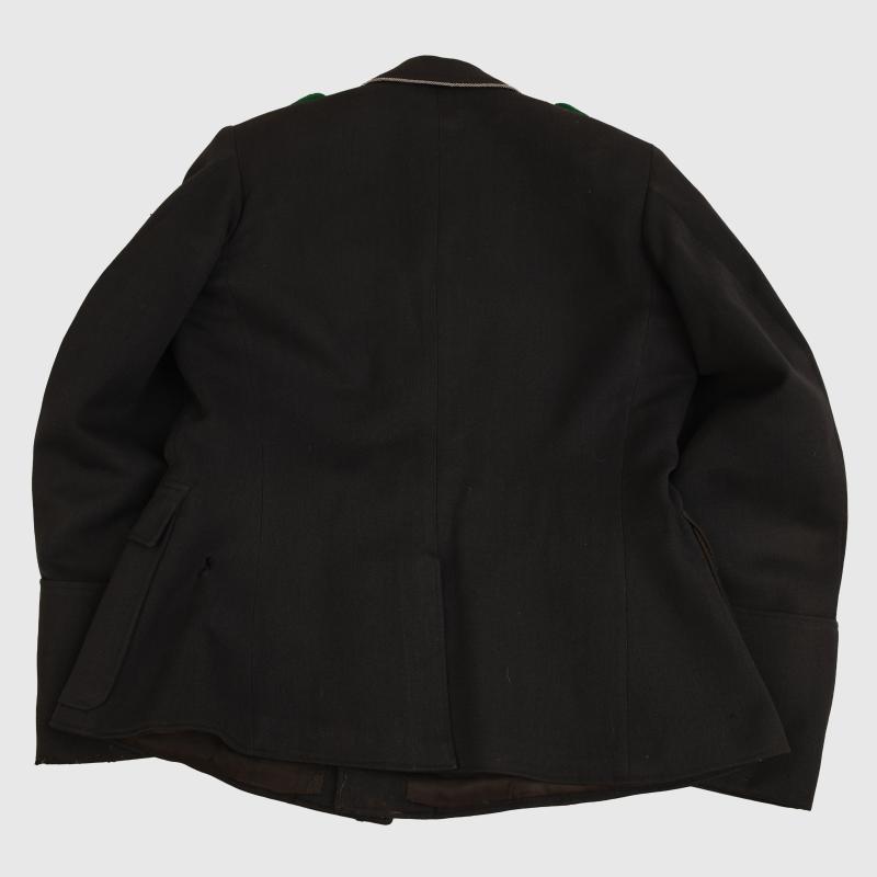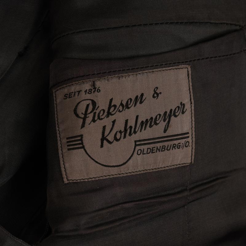 A standard Luftwaffe officers tunic, open collar wear, four button closure, four patch pockets with pleats and flaps, deep turned back cuffs, single pleat to the reverse side. The tunic has seen much service wear, there is a reasonable amount of staining around the collar area. There are some areas of moth damage below the lower pocket, both to the button and to the opening of the opposite side, the base of one cuff and tiny nips in some other places including the green waffenfarbe of the shoulder boards. The insignia is totally original to the tunic, it can only be a Luftwaffe Field Division officer, with its slightly oxidised Luftwaffe officers breast eagle. Three loops for a short medal ribbon bar above the right hand pocket, three sets of loops for three separate awards to the upper right hand pocket. A nice maker’s label of ‘Pieksen & Kohlmeyer, Oldenburg’. A dagger hanger close to the inside pocket. A tailor’s hole through the lower left hand pocket for the passing through of the dagger or sword hanger. A generally nice tunic to a rare arm of the Luftwaffe.