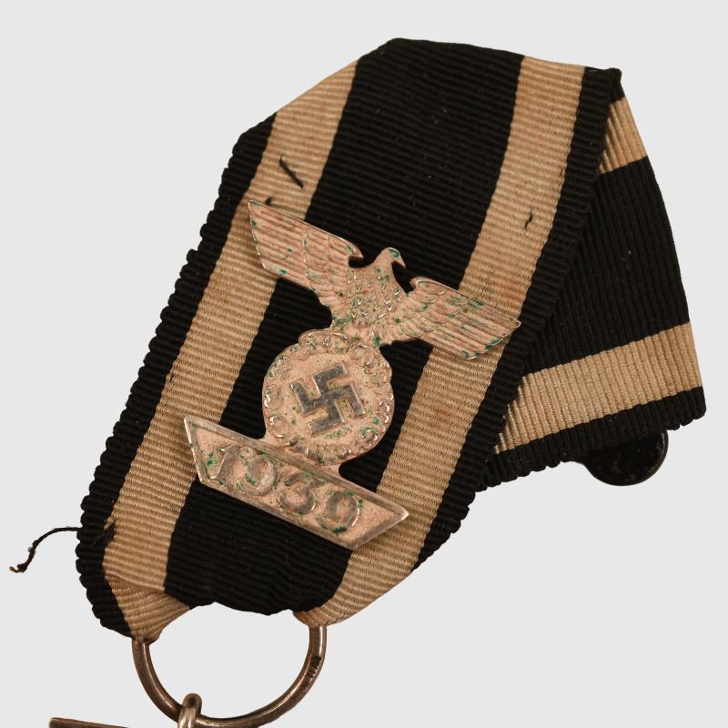 Iron cross ring marked WH, The award is in very nice condition with its original black and white ribbon and attached to the ribbon is the nicely frosted 1939 2nd World War award bar. Accompanying the main award is the identical miniature of both the 1914 Iron Cross and the 1939 Bar. A very nice set.