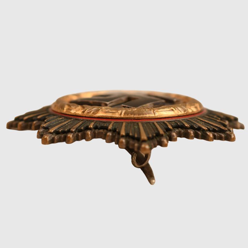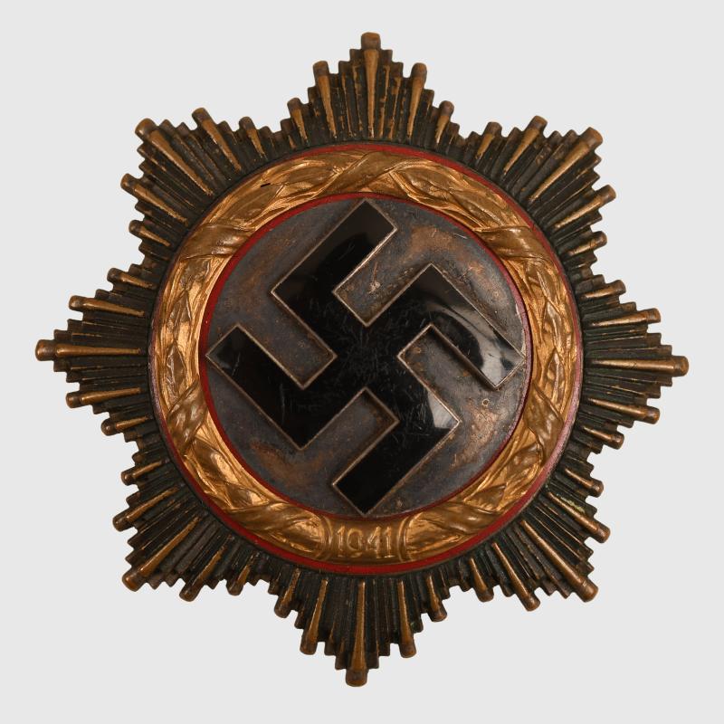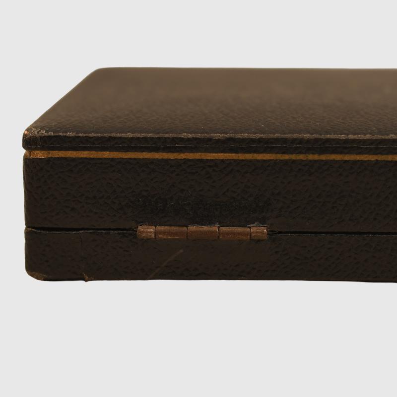 Pin marked number ‘20’ indicating the Company of Zimmermann & Company. The gilt to the 1941 dated wreath rubbed but evidence of original gilt in the lower field of the wreath. Some wear to the tips of the black ray. The enamel is undamaged but with slight scratching. Four classic Zimmermann rivets, each one hollow with the long tapering pin, original hinge and hook. Fitted into its original case with its complete and unbroken gold line. The upper inner fabric to the lid has toned and the flock base surrounding the award is rubbed. Minor nicks to the corners of the box otherwise the box and the hinge are in excellent condition.