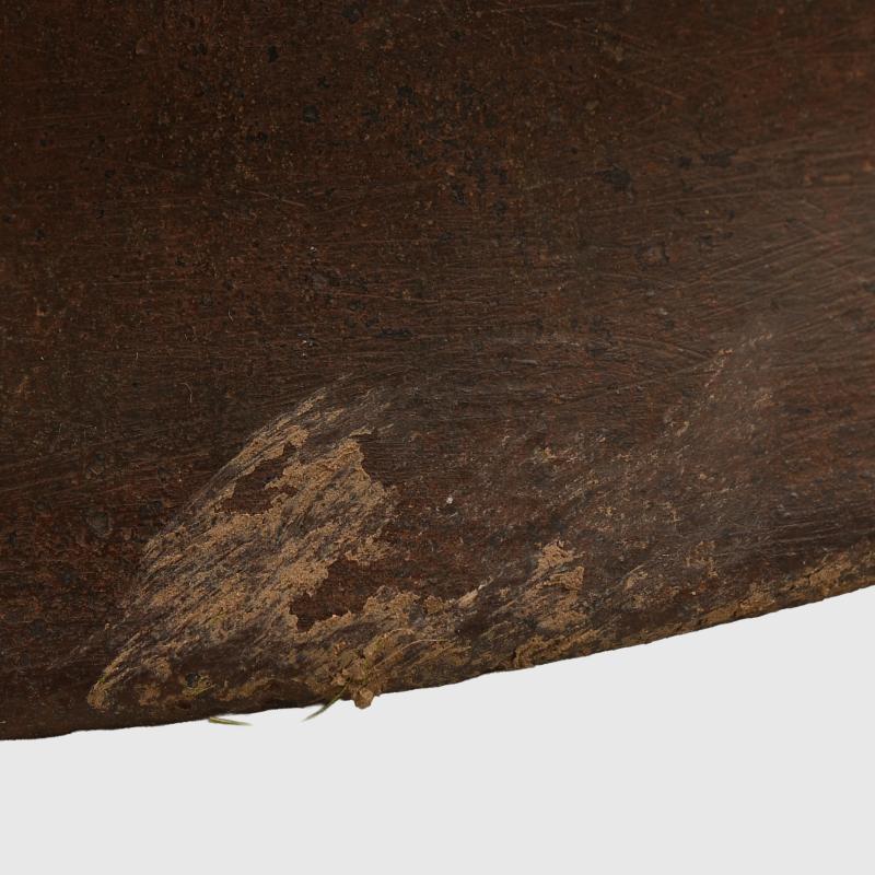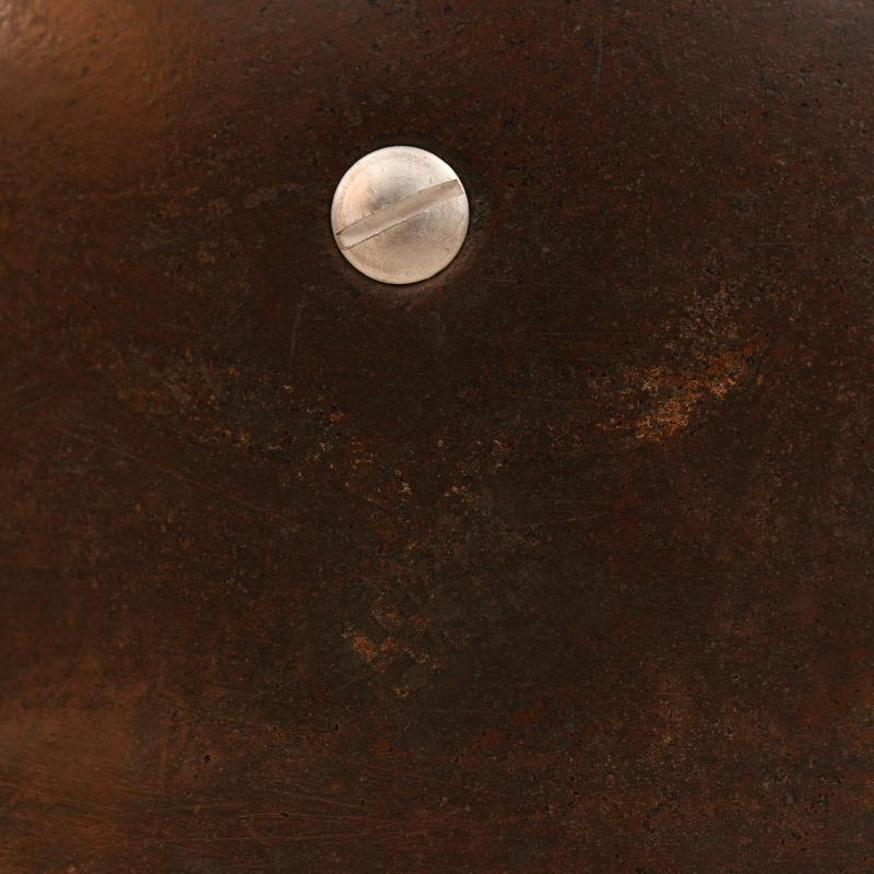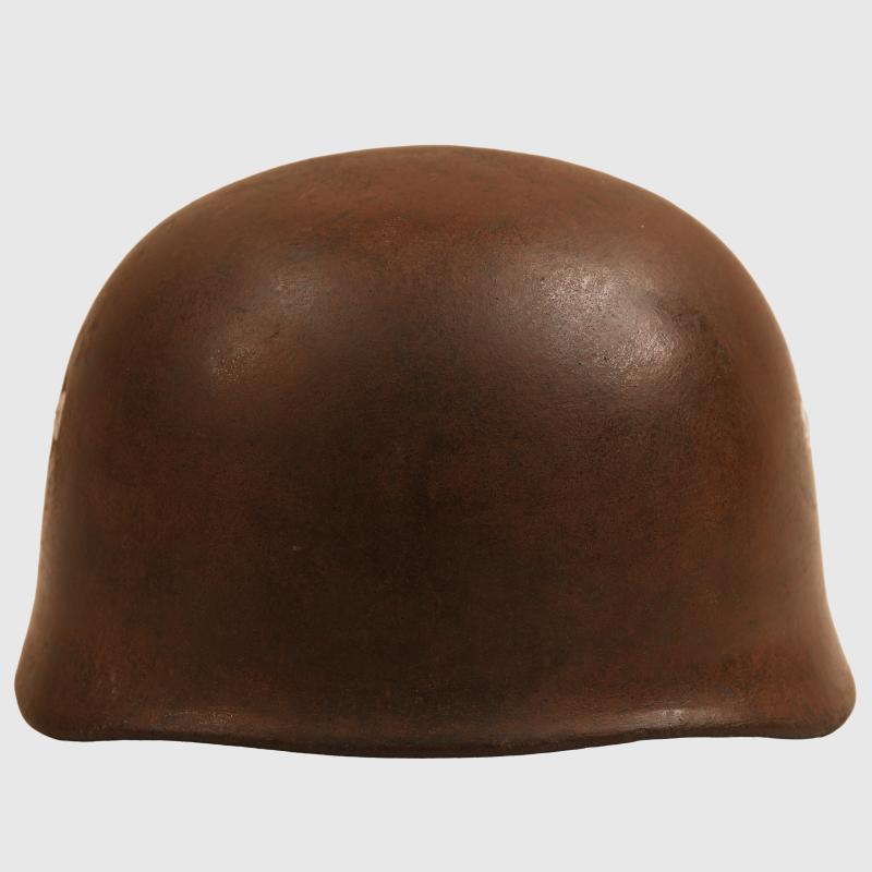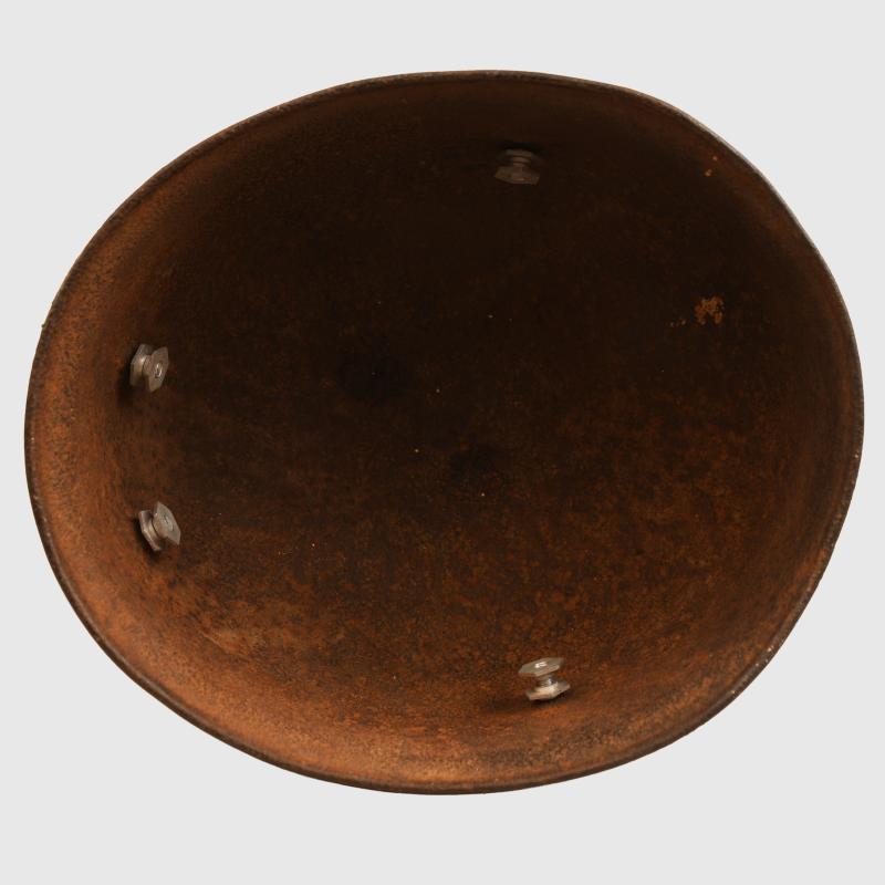 A reasonably nice example of a Luftwaffe paratrooper M.38 helmet shell. The corrosion to the interior of the bowl has obliterated the size stampings. The exterior is generally good with some minor corrosion with its Luftwaffe eagle still visible below a brown/maroon over-paint. A set of four of the late war slotted aluminium screws have been post war fitted. The liner is completely missing.