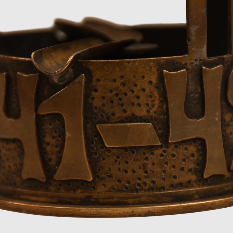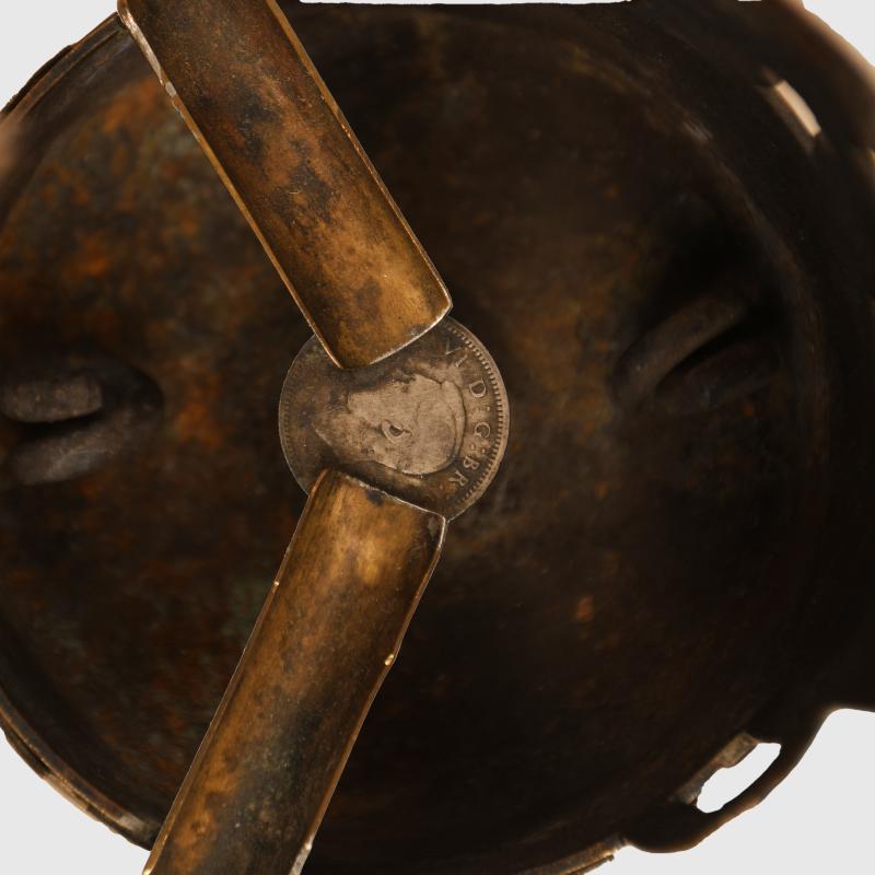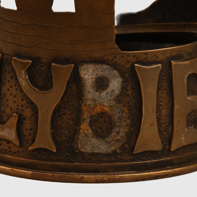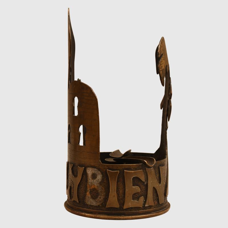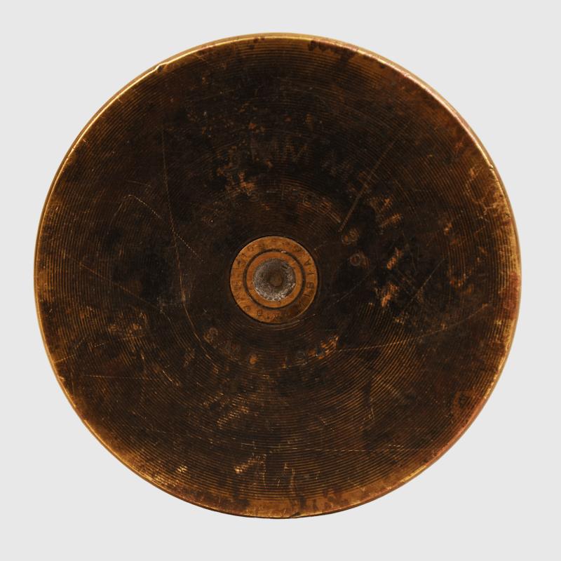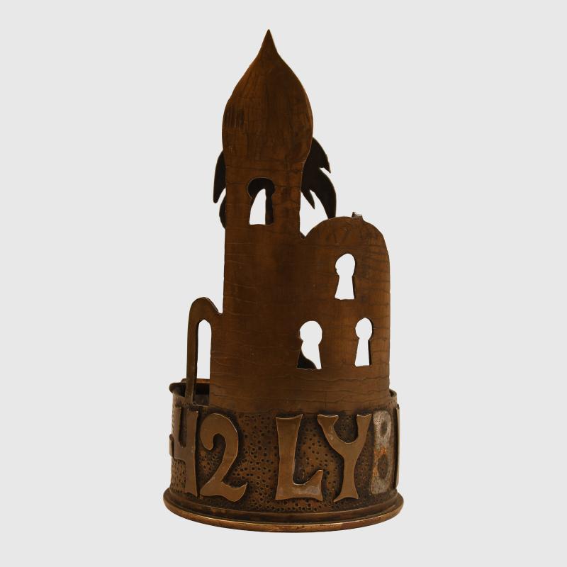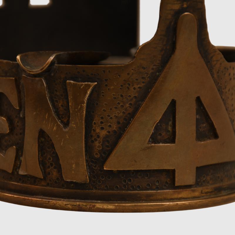 A very nice piece of German made trench art constructed out of a British brass shell case, marked ‘75mm S.M.C. 1941’. A cut out palm tree with swastika with below the unit formation insignia of the famous German 15th Panzer Division, followed by ’41-42 Lybien’ which is applied to the shell case, the ‘B’ is missing but the outline is still complete. The opposite side to the palm tree is a North African minaret. A nice item for the North African collector.