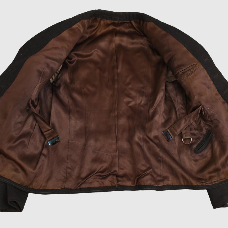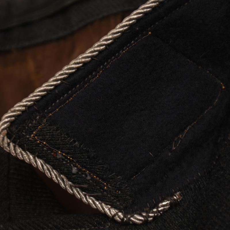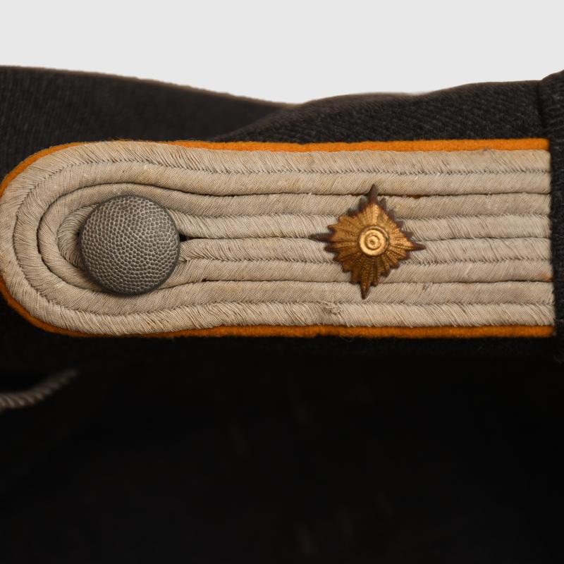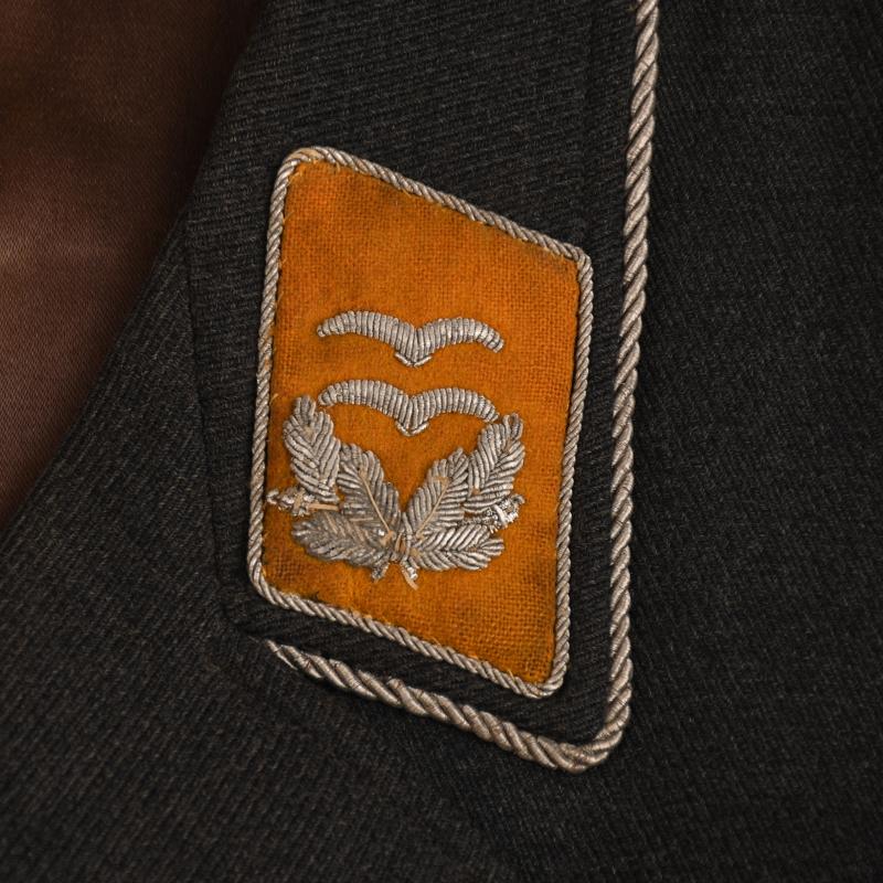 In our opinion one of the most elegant tunics of the German Luftwaffe of WWII, this medium size example in standard Luftwaffe blue grey ribbed officers quality cloth. One small repaired moth hole at the lower front skirt. Four button, fly front closure, standard open collar with officers silver cording to the collar, some wear to the inner collar in this area. Yellow based Luftwaffe Oberleutnant’s shoulder boards and matching bullion wire on yellow collar patches. A very nice quality Luftwaffe officers breast eagle with early droop tail configuration. Loops for two short medal ribbon bars and one award. A tailored hole through the lower left hand pocket, with its integral strap and D ring for the placement of the Luftwaffe sword or dagger.