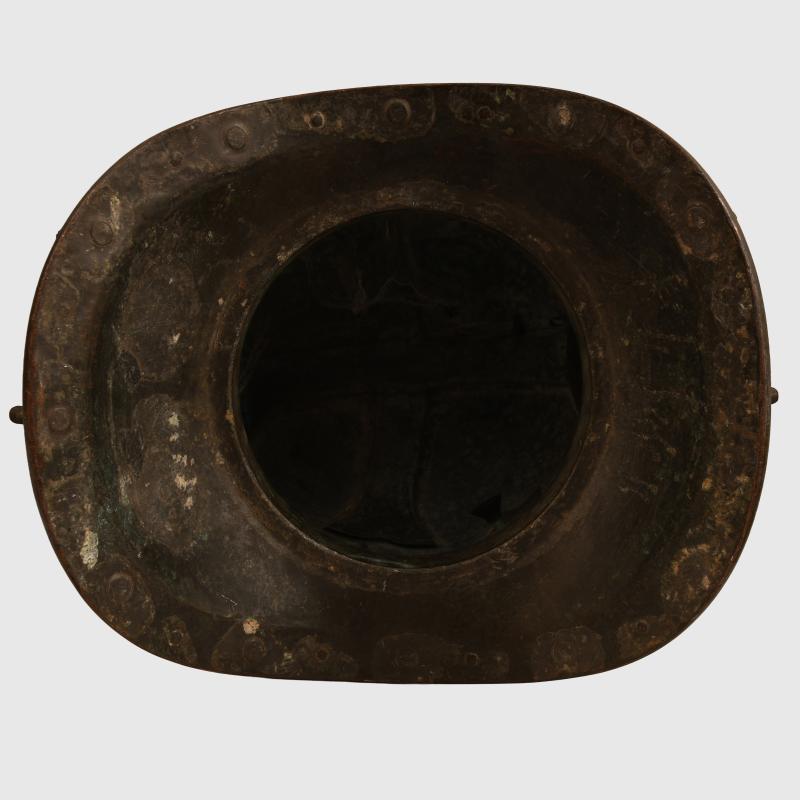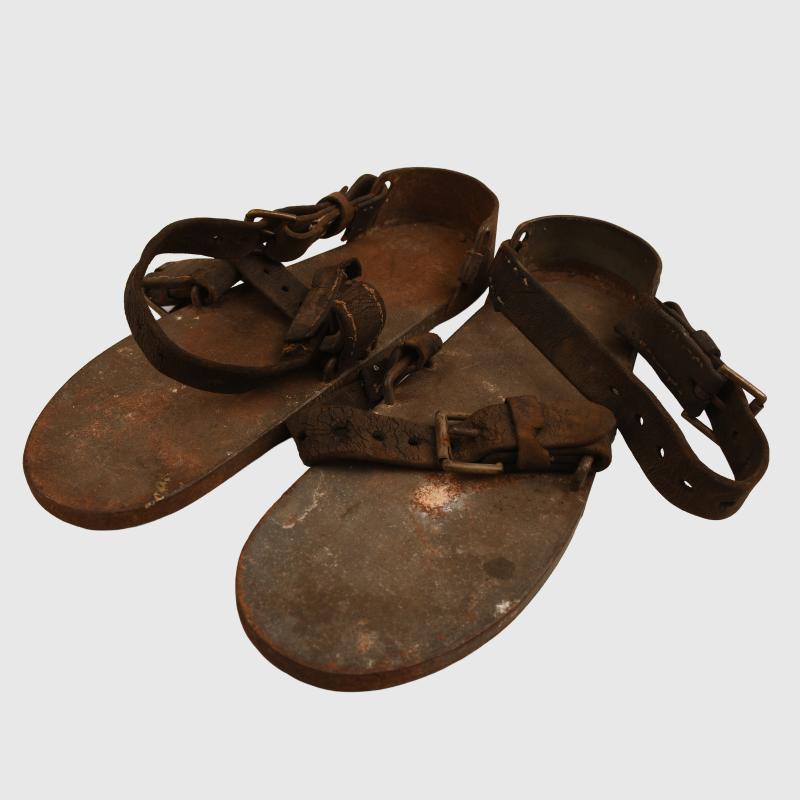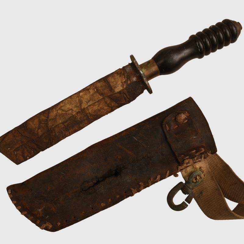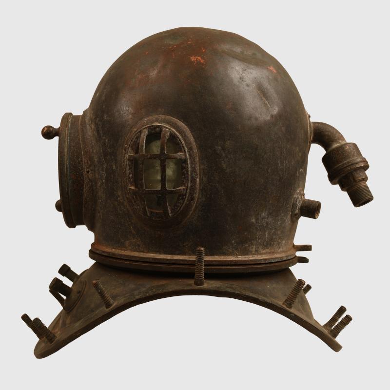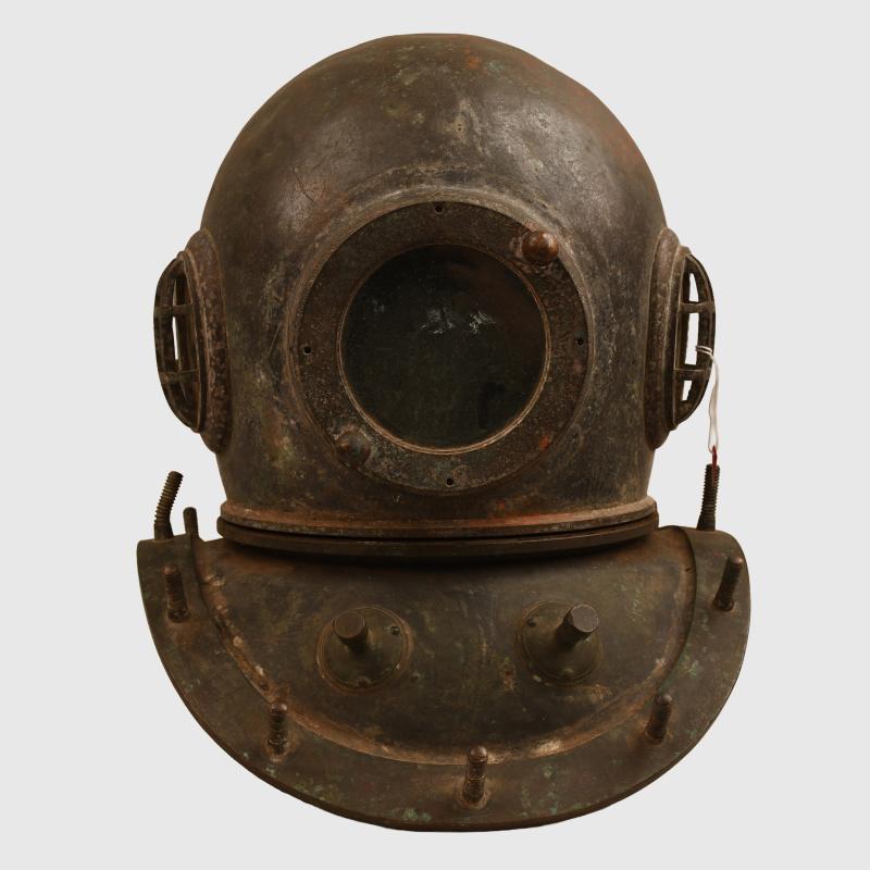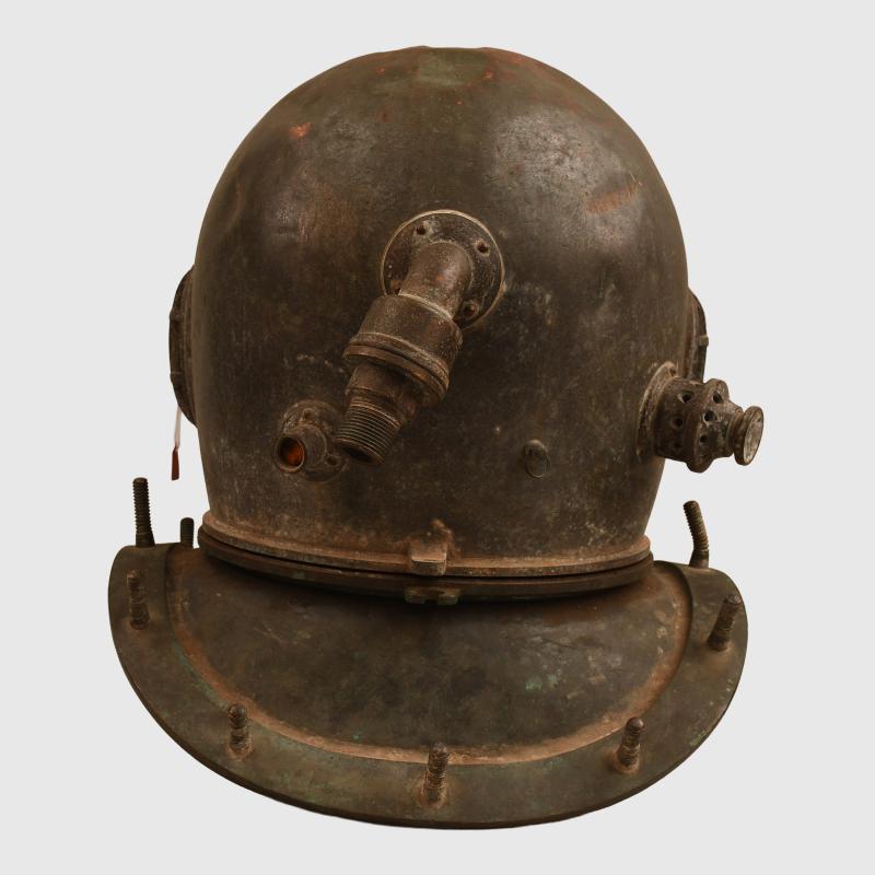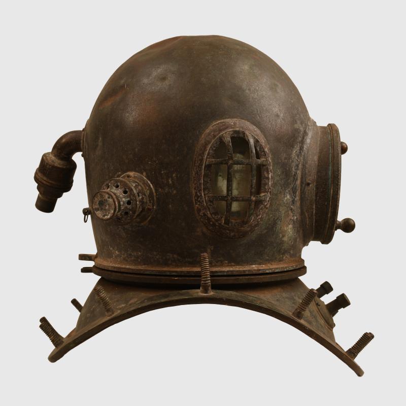 A very nice and sleepy 12 bolt Siebe Gorman deep-sea diver's helmet. All of the tinning remains on the helmet, and some indentations to the crown. The Siebe Gorman oval-shaped label is missing from the front of the helmet, and also the brass 12-hole collar that fits over the 12 studs with securing wing nuts that hold the suit water-tight in place is also missing. All other air and communication fittings are present. Accompanying the helmet are the divers' lead sandals with all leather strapping present. On his Siebe Gorman marked divers knife, the trade name is faint and all fitted into a custom-made leather scabbard of which the stitching has rotted, and it is still fitted with the long leg strap that would pass around the diving suit. These helmets were used by Royal Navy fleet clearance divers, and we estimate the date to be early 1930's. Accompanying the group are the very heavy and long communication and air pipes as seen in the photographs on our website. The whole grouping collectively is very heavy, and prior arrangements and quotations for shipping should be made directly with us.