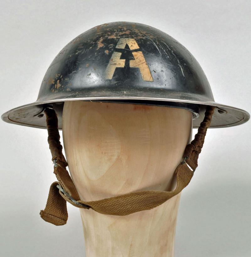 Standard Brodie helmet, two indentations to the crown, painted black with the letter ‘A’ stencilled to the front. The inner liner is size stamped and dated ‘1939’. Original owner’s name hand painted in green paint to the inner shell, also some scratched initials. The shell is dated ‘1939’ with makers stamp ‘JSS’ with its elasticated chinstrap. read more